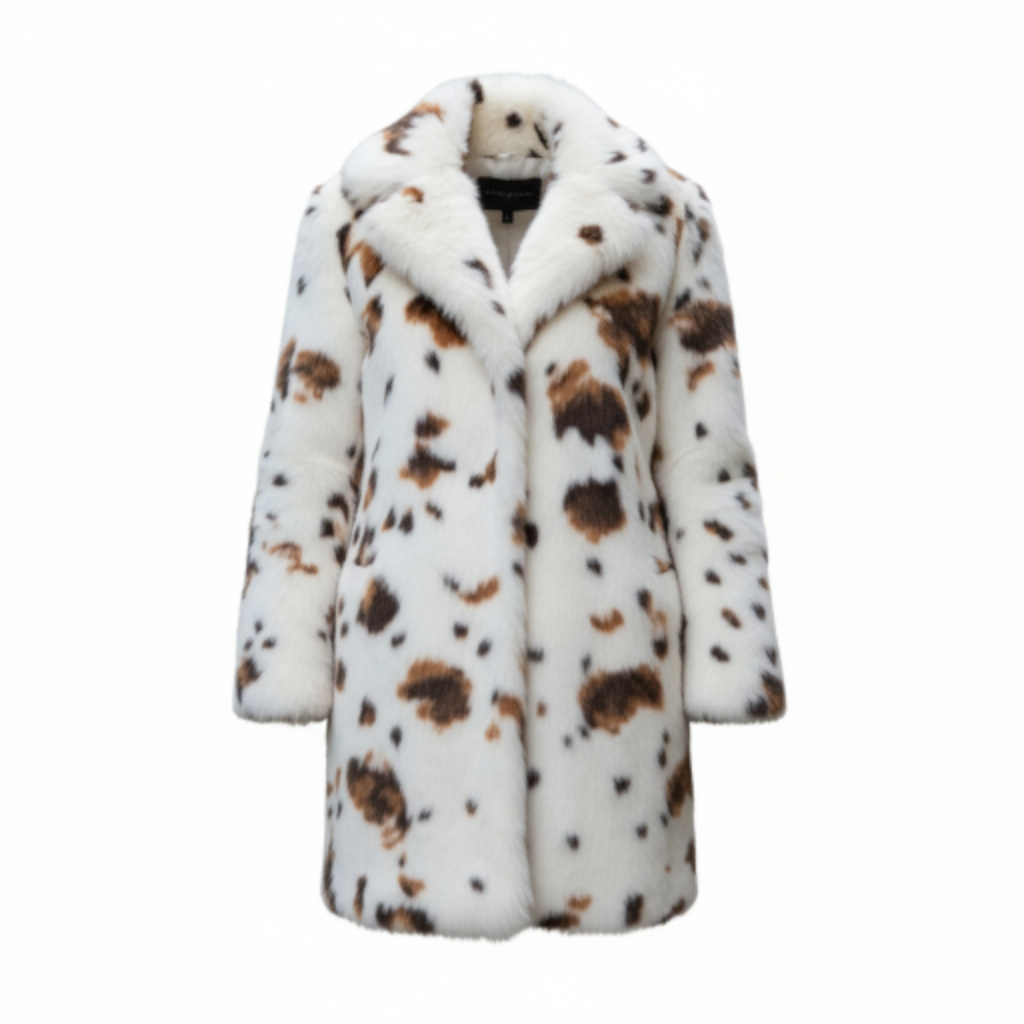 Élégante et luxueuse, cette longue veste à fourrure blanche aux nuances marronées sublime la silhouette. Un must-have pour un hiver tout en style.