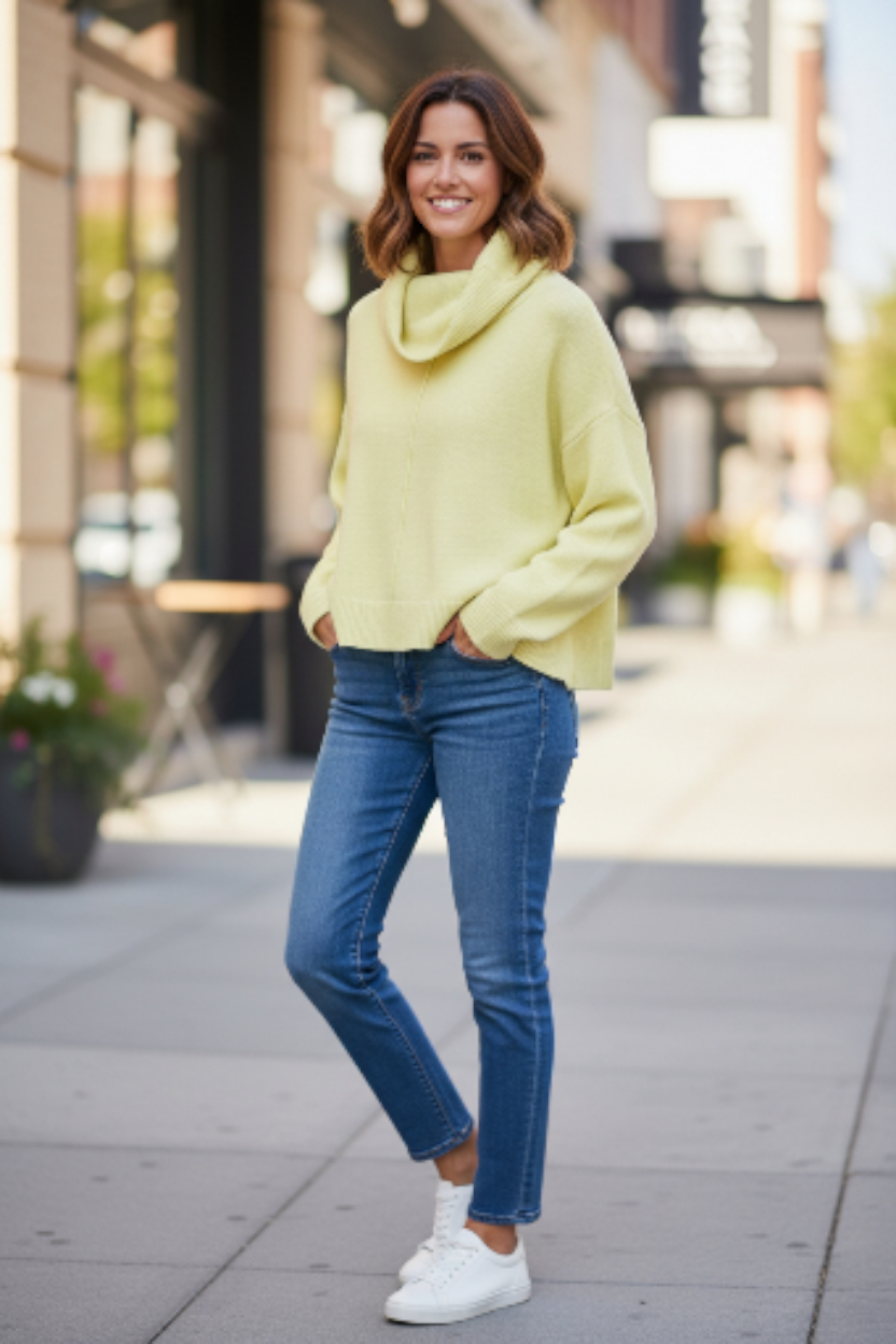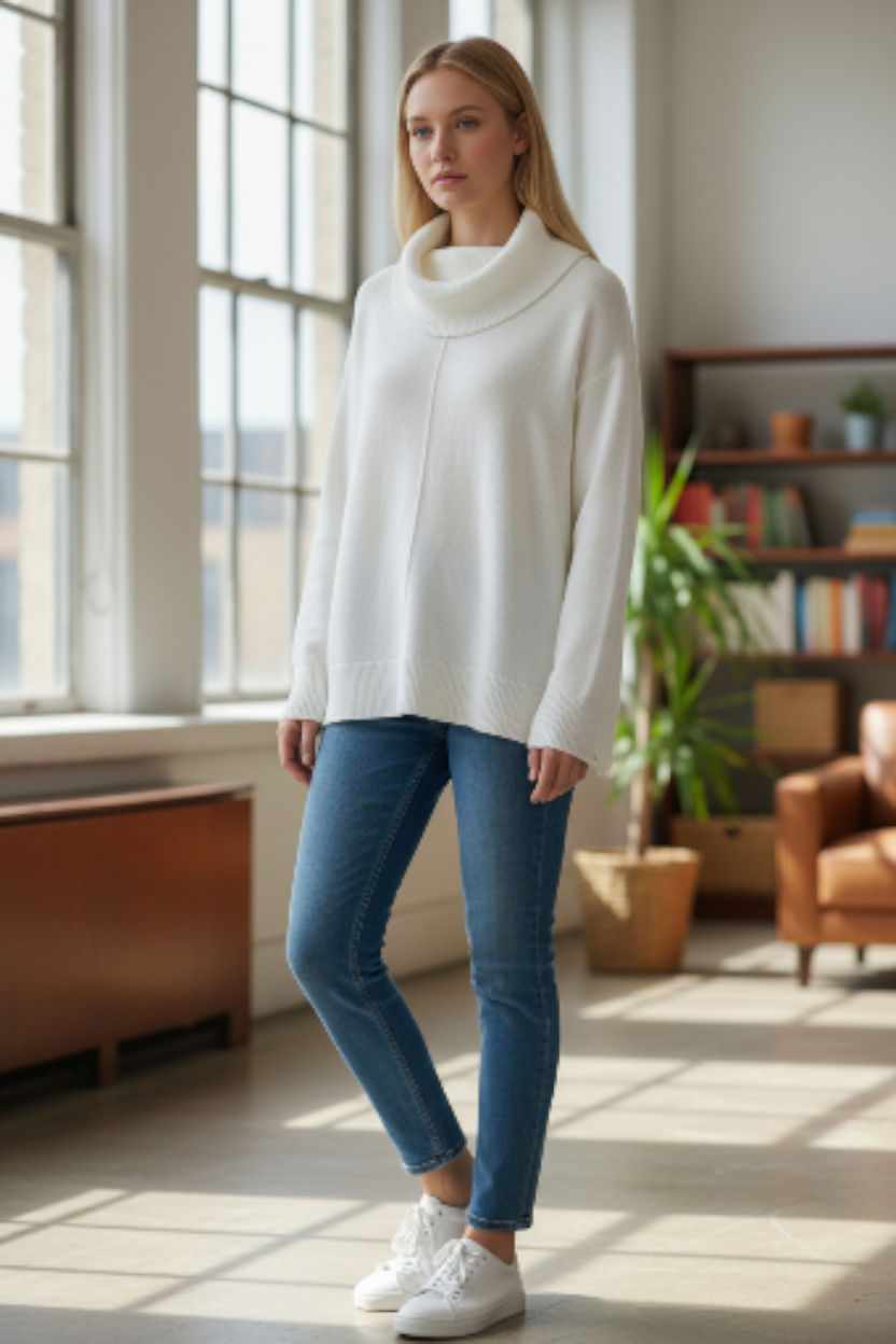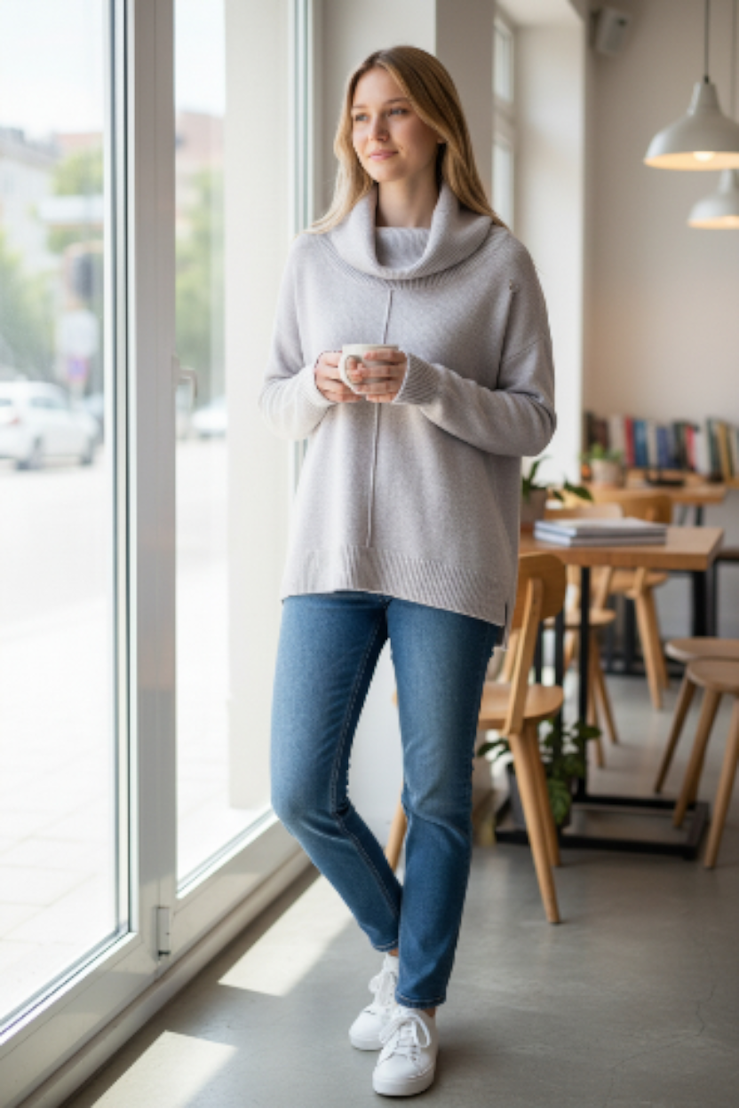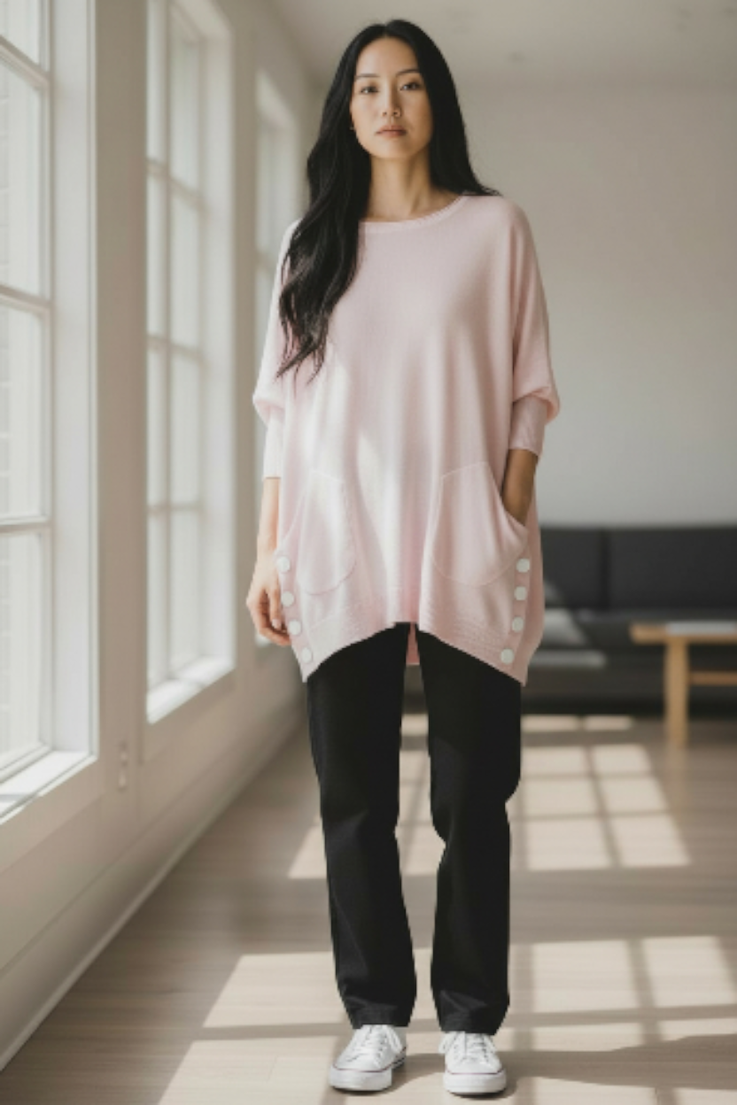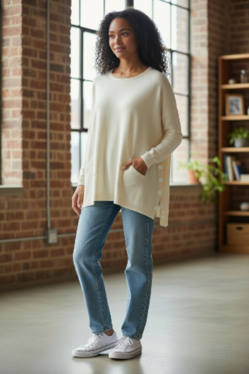 Pull long en maille douce et enveloppante, à la coupe ample et confortable. Détails pratiques avec poche sur le devant et boutons décoratifs sur le côté. Idéal pour un look cosy et élégant au quotidien.