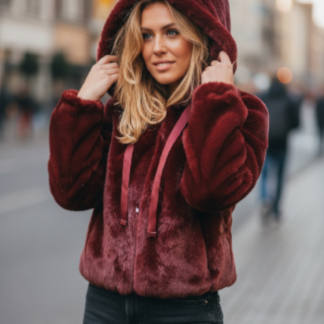 Allure urbaine et élégance assurée avec cette fourrure Camel courte à capuche, dotée de deux cordons pour une touche streetwear chic.