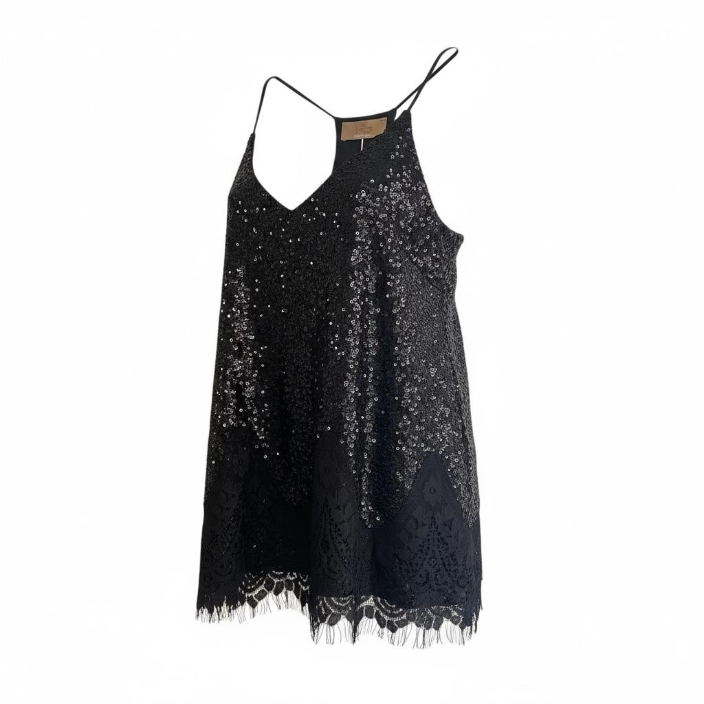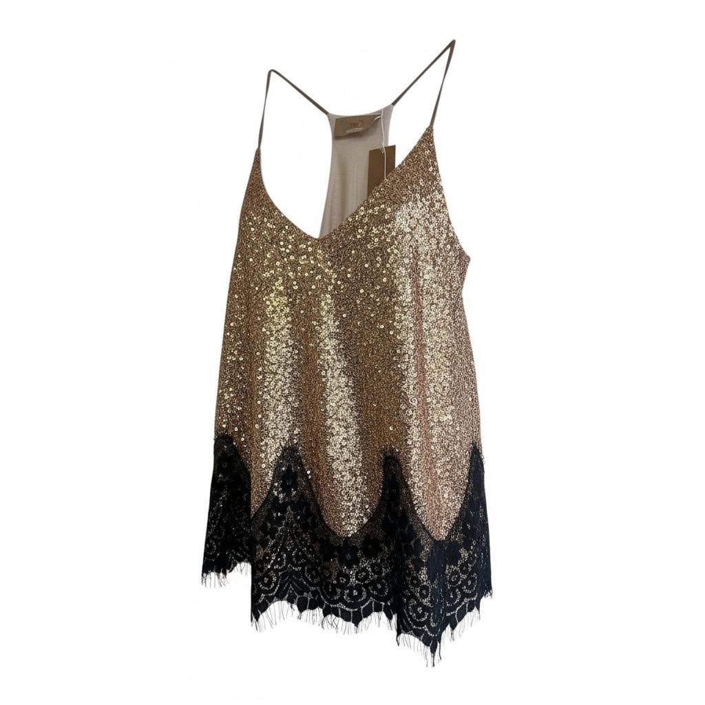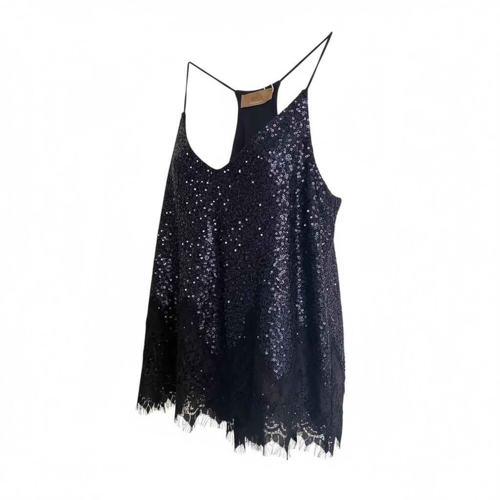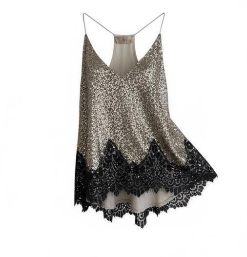 Brillez avec élégance grâce à ce top débardeur à paillettes, sublimé par une délicate bordure en dentelle.