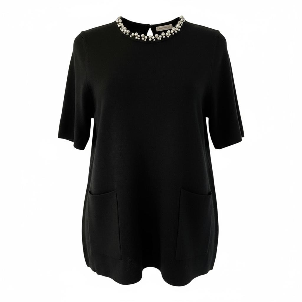 Un basique chic : t-shirt effet pull avec col à strass pour une touche lumineuse et raffinée.