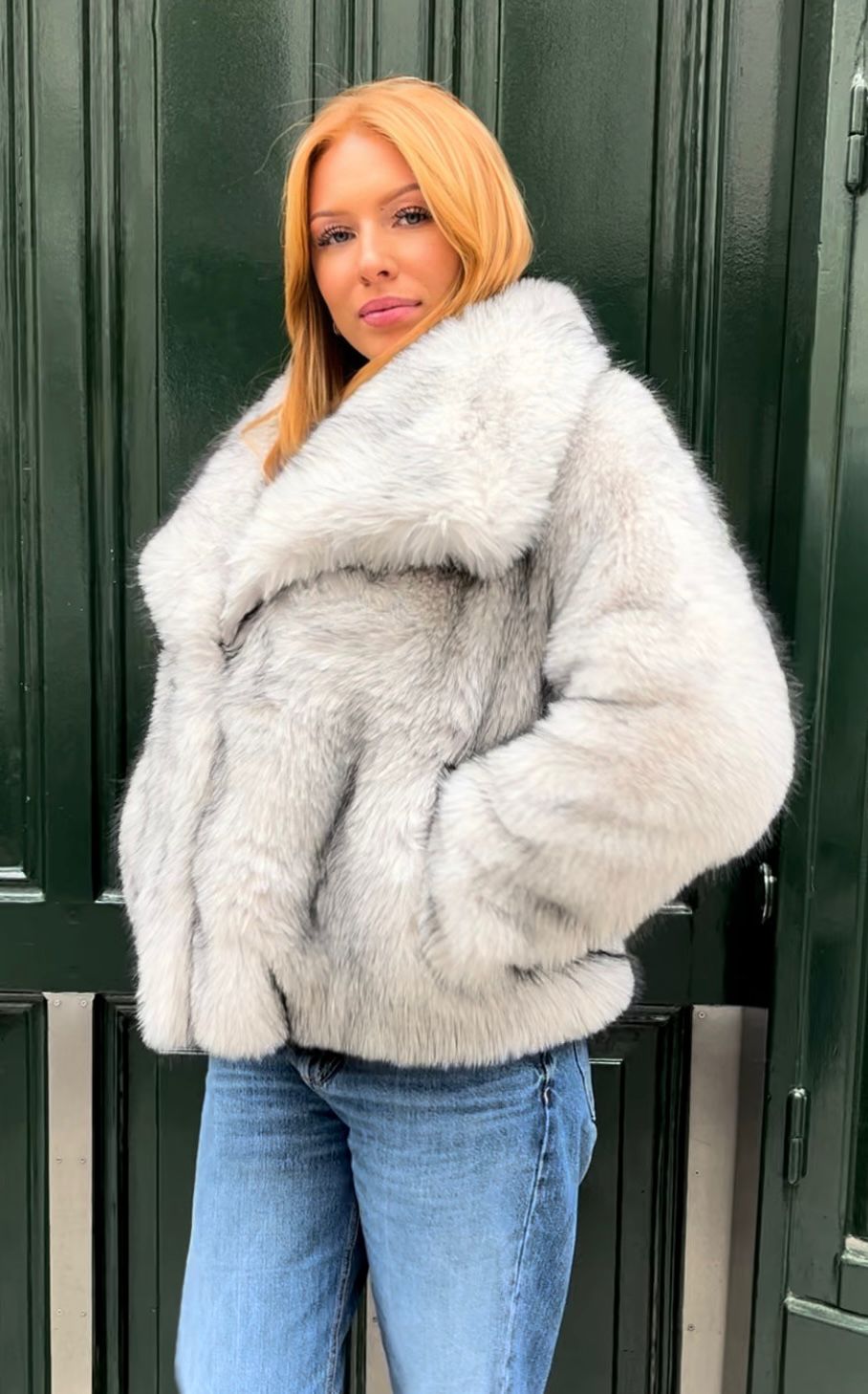 Adoptez le look du moment avec cette fourrure courte et volumineuse, parfaite pour un style à la fois chic et audacieux.