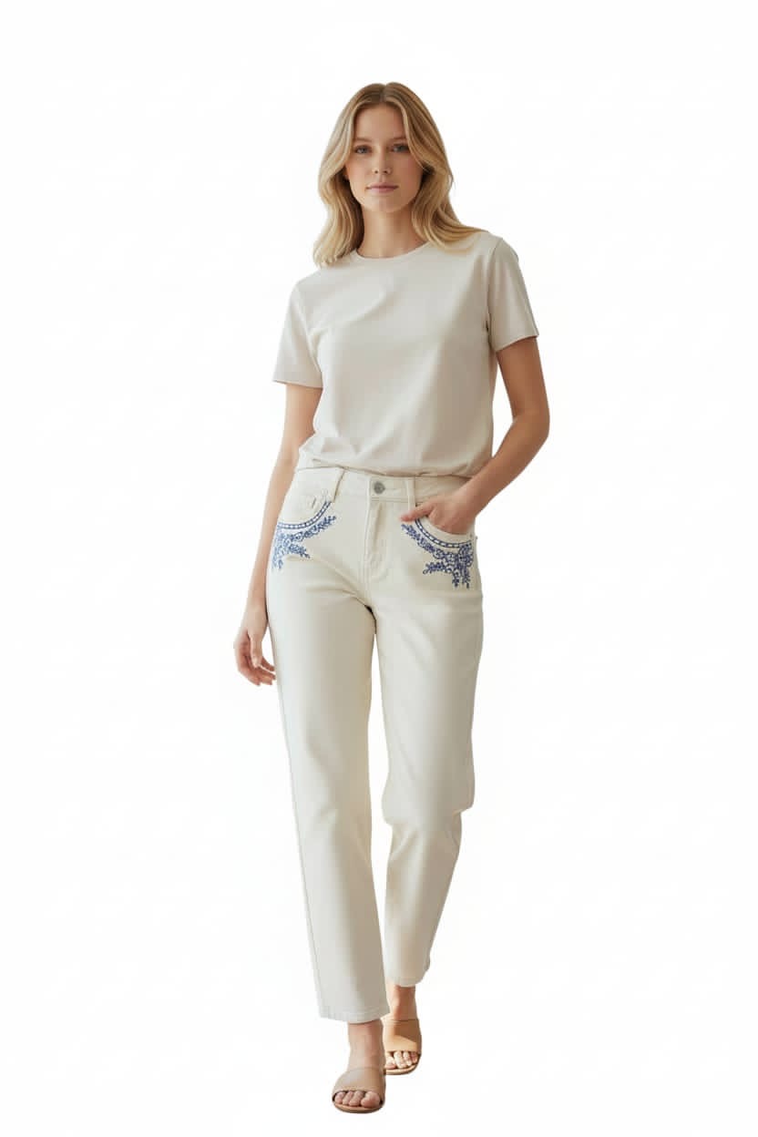 Ce jean droit écru à broderies revisite l’intemporel denim avec une élégance lumineuse et féminine. Conçu pour sublimer la silhouette sans sacrifier le confort, il se distingue par sa coupe droite légèrement ajustée et extensible, idéale pour un porté quotidien chic. Sa teinte claire apporte de la fraîcheur à toutes les tenues, tandis que les broderies bleues délicates sur les poches ajoutent une touche artisanale raffinée. Facile à associer avec un t-shirt minimaliste, une blouse romantique, un sweat ou un blazer structuré, ce jean devient rapidement une pièce essentielle du vestiaire.