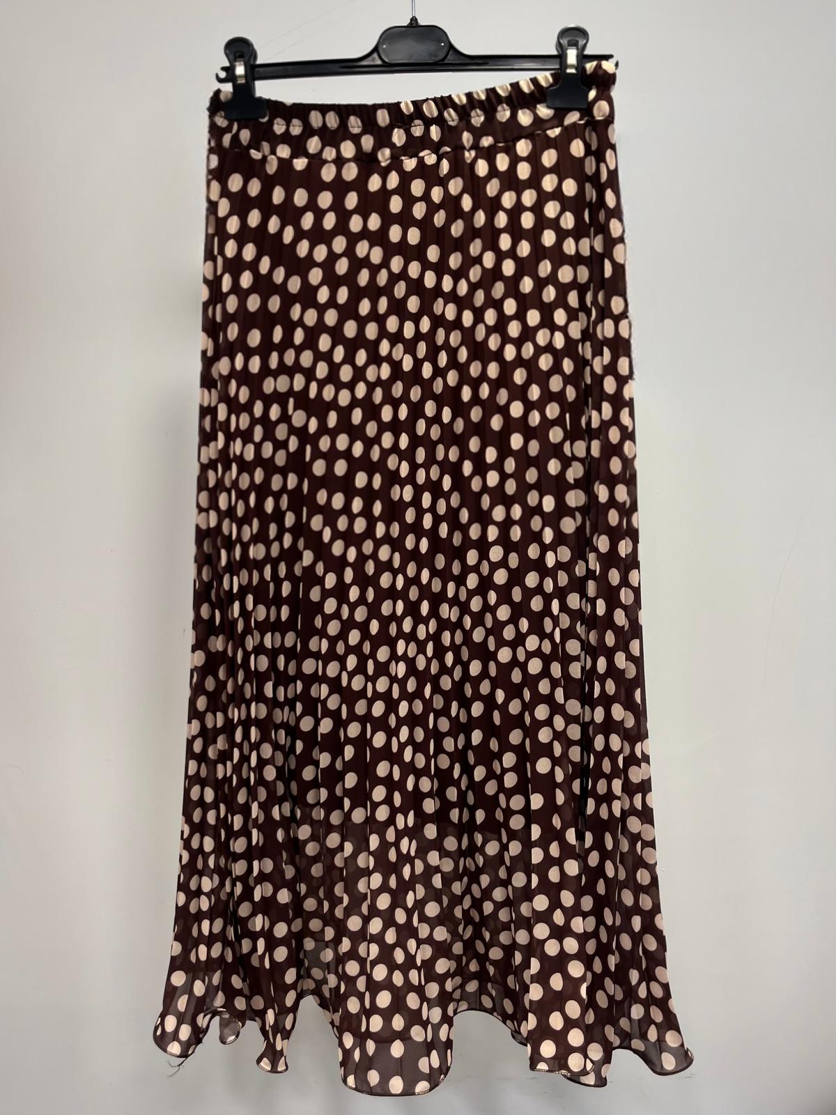 Craquez pour cette jupe longue marron foncé plissée à pois, légère, tendance et facile à porter au quotidien.