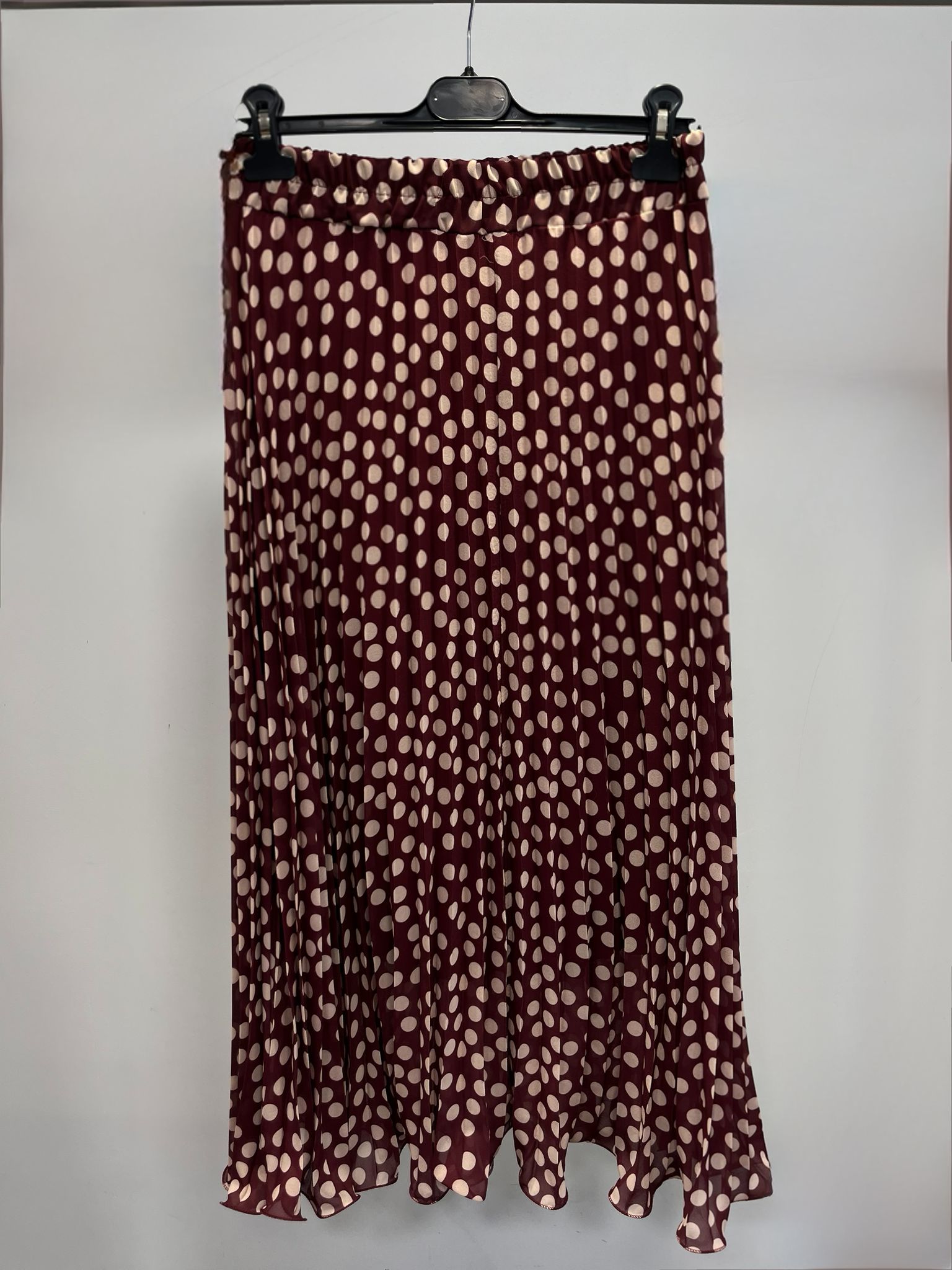 Craquez pour cette jupe longue plissée bordeaux à pois, légère, tendance et facile à porter au quotidien.