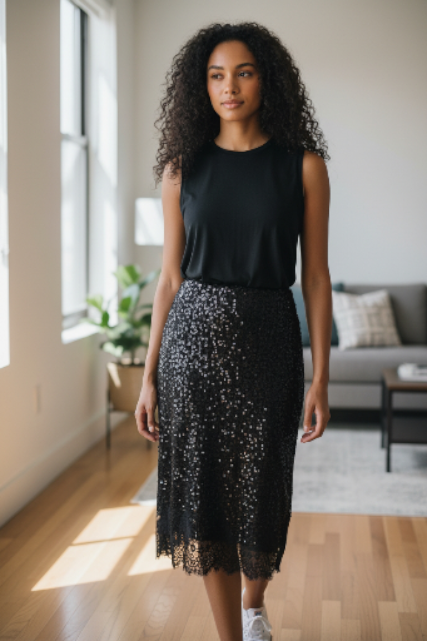 Brillez avec élégance grâce à cette jupe à paillettes, sublimé par une délicate bordure en dentelle.