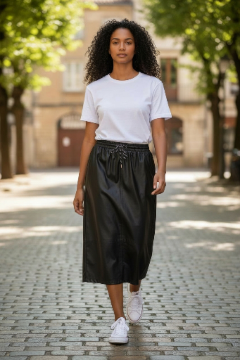 Chic et audacieuse, cette jupe longue en similicuir séduit par sa fente discrète à l’arrière.