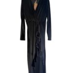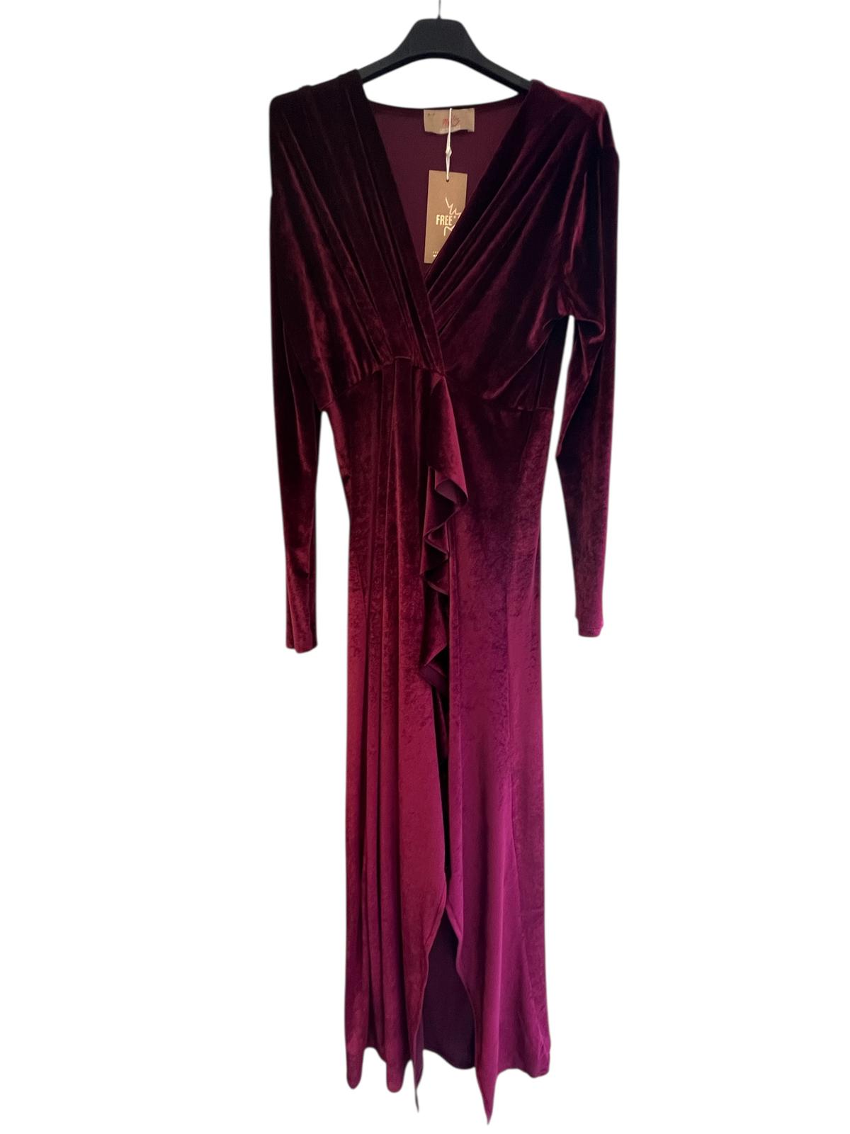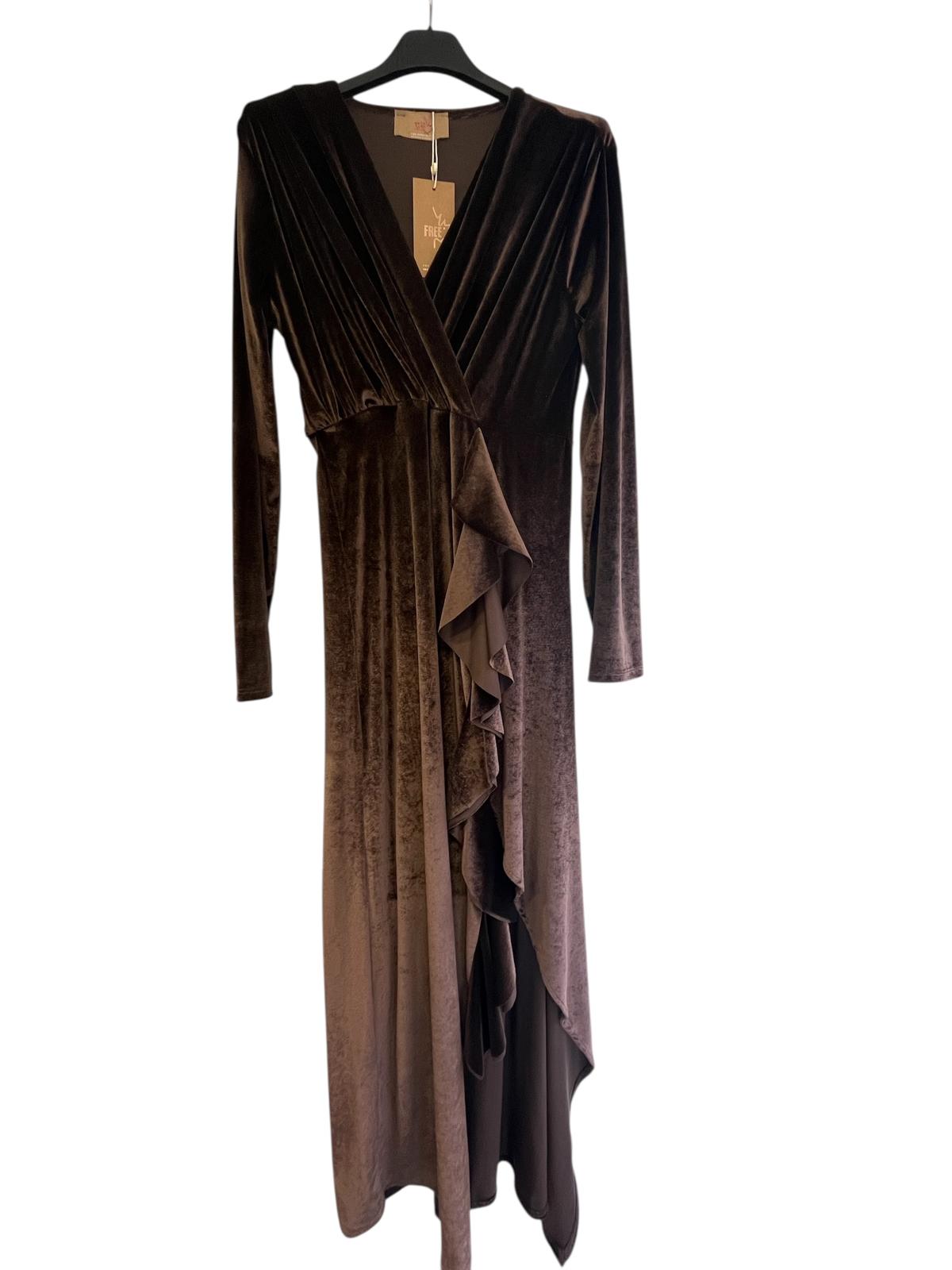 Élégante et sensuelle, cette robe longue en velours séduit par sa fente latérale raffinée.