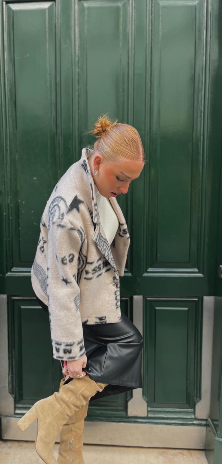 Adoptez un style unique avec cette veste courte crème à motifs. Une pièce moderne qui rehausse instantanément votre tenue.