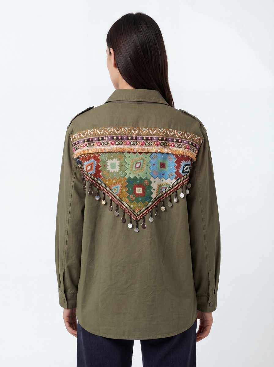 Son design structuré à l’avant contraste subtilement avec son dos richement travaillé. Les ornements bohèmes délicats apportent une dimension artisanale et authentique à la pièce, transformant une veste classique en véritable élément signature. Broderies, motifs inspirés et finitions soignées créent un effet visuel unique qui attire le regard tout en restant élégant.