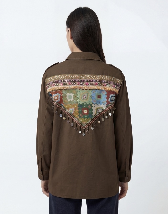 Apportez une touche d’originalité à votre dressing avec cette veste style chemise à ornements bohème au dos, une pièce forte qui combine esprit casual et détails raffinés. À mi-chemin entre la chemise overshirt et la veste légère, elle s’impose comme l’indispensable des looks modernes et affirmés.